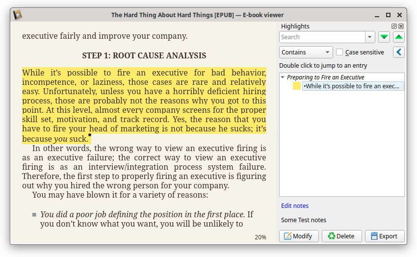 First, highlight a section in a book and maybe also jot down some notes in a book using calibre: